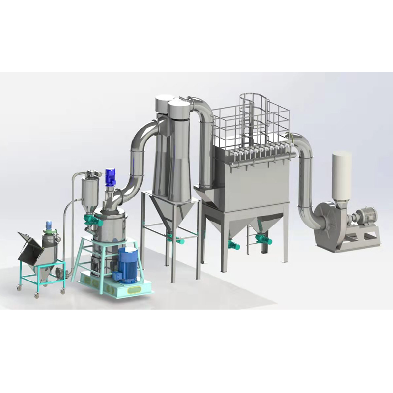 分級電機帶動分級輪旋轉,形成對粉體的分級作用。成品粒徑的大小可通過分級輪轉速的快慢進行調節(jié)。不符合要求的粗顆粒被葉片拋向外壁在重力的作用下落入研磨室繼續(xù)進行研磨,符合要求的顆粒穿過葉片隨氣流形成氣固兩相流,吸入旋風集料器內,氣流與粉體顆粒被氣固分離后,粉體顆粒被收集。