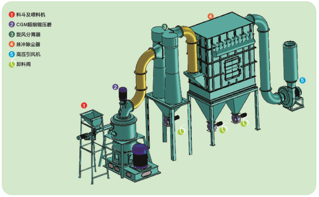① 與雷蒙磨、氣流粉碎機相比同等動力條件下生產效率高一倍以上,磨輪對物料的碾壓力在高壓離心力的作用下提高30~40%。